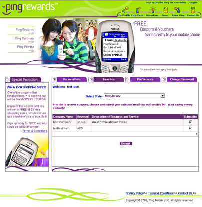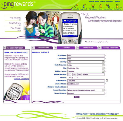 Simply browse through the list and choose your favorites. Once you click them and save these stores as your favorites, you'll start receiving coupons and vouchers for discounts directly on your mobile phone. Come back to PingRewards™ anytime to update your list of favorites, and to change your settings. Join now for free to view all the local stores in your area that want to send you coupons and instantly start saving money. PERSONAL PROFILE Once you fill in the Join Now form, Ping will automatically set up your personal profile page - which you can access anytime via the PingRewards™ Web site.